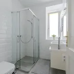 De er udsigt over haven, mens badeværelset er udstyret med et badekar og en bruser.